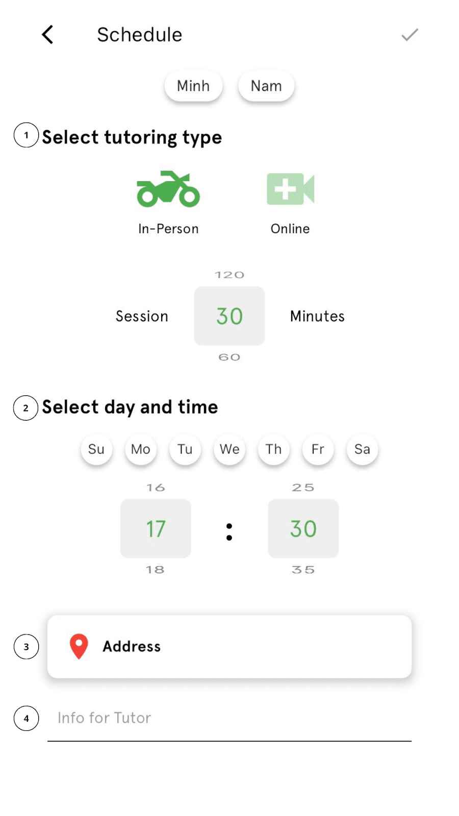 1. Select tutoring type: Đăng ký cho bé học tại nhà (In Person) hoặc Online. Và chọn thời gian học phù hợp cho bé (60, 90 hoặc 120 phút).